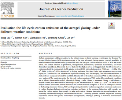 近日,星空体育官方网站 刘洋课题组在《Journal of Cleaner Production》(中科院一区,IF=11.1)发表题为“Evaluation the life cycle carbon emissions of the aerogel glazing under different weather conditions”(气凝胶玻璃在不同气候条件下的全生命周期碳排放评估)的研究论文。