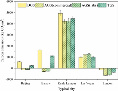 该研究建立了气凝胶玻璃全生命周期碳排放模型,并在全球的不同气候分区上模拟气凝胶玻璃的全生命周期碳排放量,并分析使用朝向、气凝胶层厚度等因素对全生命周期碳排放的影响情况。结果表明,气凝胶玻璃具有更高的减碳潜力相较于双层中空玻璃和三层中空玻璃。在不同气候下,气凝胶玻璃呈现出不同的减碳潜力,其适用性序列为亚热带气候<极地气候<温带气候<干旱气候<热带气候,与亚热带气候相比,在热带气候使用气凝胶玻璃时碳排放量增加了5.9倍。同时,分析了朝向对于气凝胶玻璃全生命周期碳排放的影响,在以供暖为主的气候,在南向使用气凝胶玻璃时的减碳潜力较大,而在以供冷为主的气候,南向时较弱。同时,在极地气候和热带气候,增加气凝胶层的厚度可以有效的降低气凝胶玻璃全生命周期碳排放量。